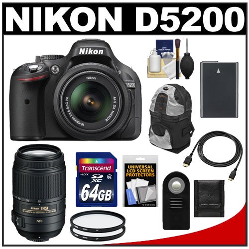 What do you think about Nikon D5200 Digital SLR Camera & 18-55mm G VR DX AF-S Zoom Lens (Black) with 55-300mm VR Lens + 64GB Card + Battery + Backpack Case + Filters + Accessory Kit?