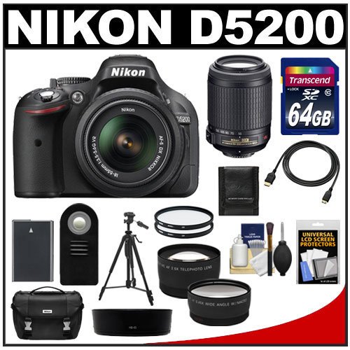 What do you think about Nikon D5200 Digital SLR Camera & 18-55mm G VR DX AF-S Zoom Lens (Black) with 55-200mm VR Lens + 64GB Card + Battery + Case + Tripod + Tele/Wide Lenses + Remote + Accessory Kit?