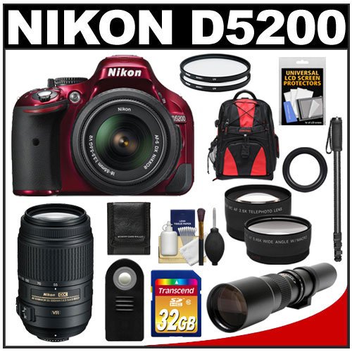 What do you think about Nikon D5200 Digital SLR Camera & 18-55mm G VR DX AF-S Zoom Lens (Red) with 55-300mm VR + 500mm Telephoto Lens + 32GB Card + Backpack + Tele/Wide Lenses + Monopod + Accessory Kit?